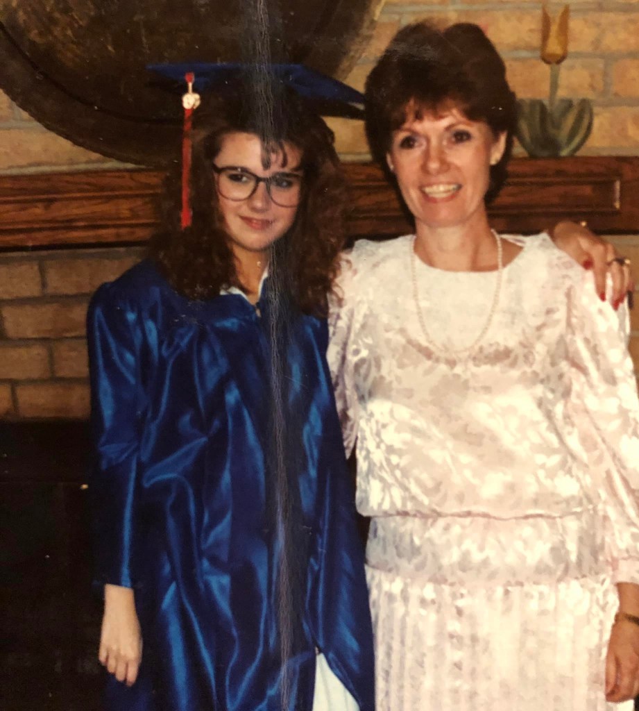 Check out the picture of me and my sweet mom when I graduated from high school. Don’t even get me started on those glasses!!!! Actually, I think that style is back in. The second picture is me and my friend Jennifer at prom. I’m the one on right thinking I’m all that with my electric blue eyeliner.